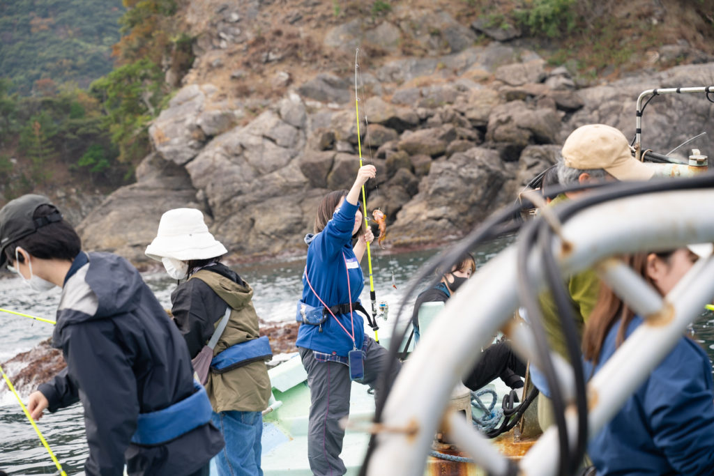 堤防でレクチャーも含め1時間半程度釣り。その後浦谷さんが船を出してくださるということで船釣りへ。波と一体化したように揺れる船から釣りをするのは未知の感覚で面白かった。ピンと張った釣り糸に魚の食いつきがブルブルと伝わり、リールを巻き上げながら感じる、投げ入れた時とは明らかに違う質量。いざ引き上げてみて魚がついていた時の興奮は、今でも鮮明に思い出せるほどだ。ちなみに、このトップ画像は私が釣ったキジハタ。口を持つと比較的暴れないらしい。実際写真を撮れるくらい大人しかった。