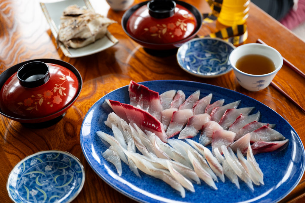 釣った魚は浦谷さんに調理して頂いた。私も微力ながらお手伝いをさせてもらった。あまり料理をしないため、包丁を握ることすら少し緊張していたが、どこを切ればいいのかなど、浦谷さんに丁寧に教えて頂いた。魚一匹の大体半分くらいの位置でえらを切るのだが、これがそこそこ固く、最初は本当に切っていいのか戸惑った。そのうち段々慣れてきて迷いもなくなっていき、作業も早くなってきたように感じていたが、私が1匹捌く間に浦谷さんは4匹ほど捌いており、その速さに驚愕した。外でみんなが釣った魚を捌いた後は、旧旅館のキッチンに入り、事前に用意してくださっていた魚の調理に移った。