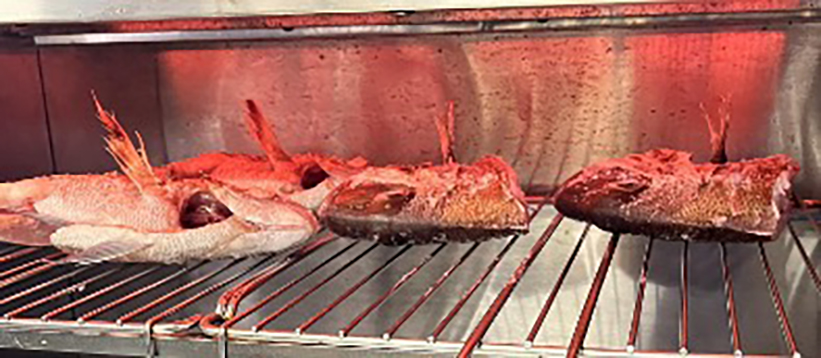 まずはヤガラの調理から行った。皮をはぐ作業を行ったが、皮と身を持って裂くようにやるときれいに剥けた。浦谷さんは鯛の調理をしていた。手で塩を取り、指の間から落とすことで塊となった塩が落ち、あら塩のようになるという。洗い物をしている間、白身と皮が焼ける香ばしい匂いに、オーブンで焼き上げられている鯛の出来上がりを今か今かと眺めていた。