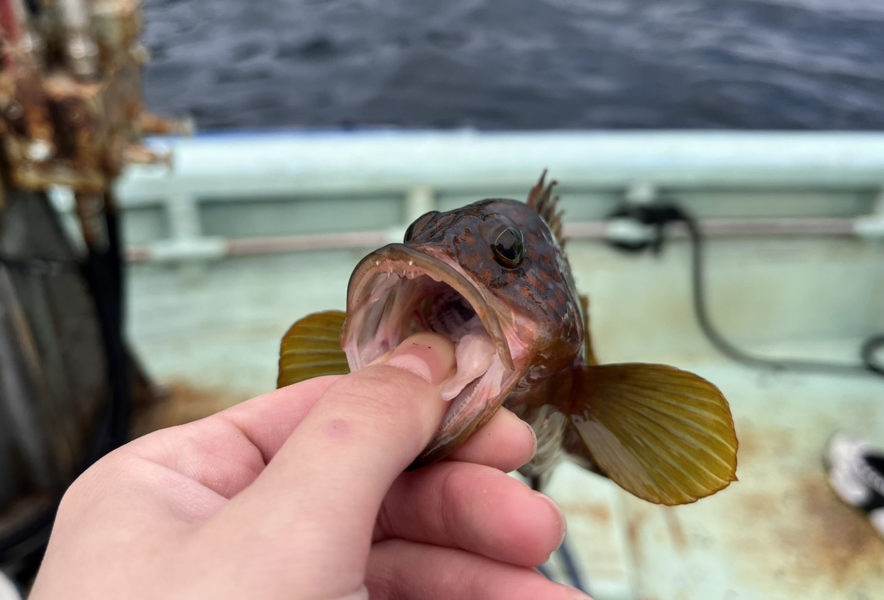 堤防でレクチャーも含め1時間半程度釣り。その後浦谷さんが船を出してくださるということで船釣りへ。波と一体化したように揺れる船から釣りをするのは未知の感覚で面白かった。ピンと張った釣り糸に魚の食いつきがブルブルと伝わり、リールを巻き上げながら感じる、投げ入れた時とは明らかに違う質量。いざ引き上げてみて魚がついていた時の興奮は、今でも鮮明に思い出せるほどだ。ちなみに、このトップ画像は私が釣ったキジハタ。口を持つと比較的暴れないらしい。実際写真を撮れるくらい大人しかった。
