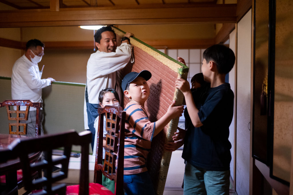 おかげ様で見事に「微Bar」の売り上げで畳6畳分を達成。地元の子ども達にも手伝ってもらいながらみんなで2階へ畳を運ぶ。新品の畳の井草の香りがこの空き家の新たな息吹のように部屋に広がり、6畳間の“開床”は無事成功した。子ども達が新しい畳に寝転んで「今日ここ泊まるー!」とはしゃぐ姿がなんとも微笑ましかった。
