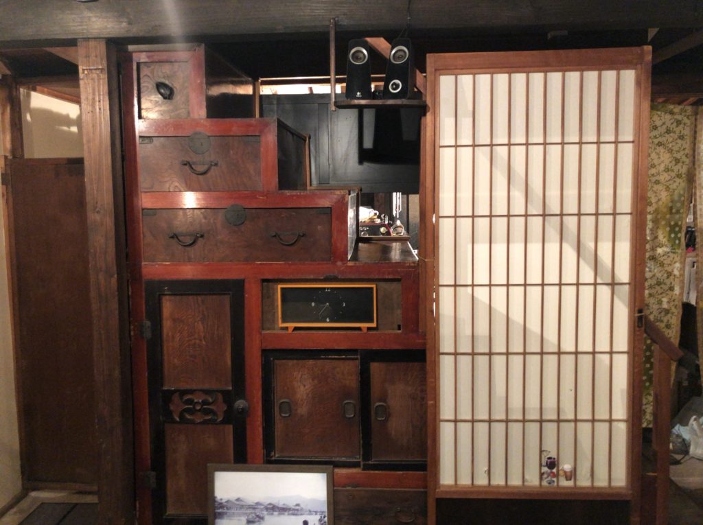 お店に入ると店内には目を引くものがいくつもある。行燈入れがついた階段箪笥。これは電灯がない時代、つまり明治以前の時代に作られたものだそう。ほかにも、お店には船底天井や大正硝子などがある。