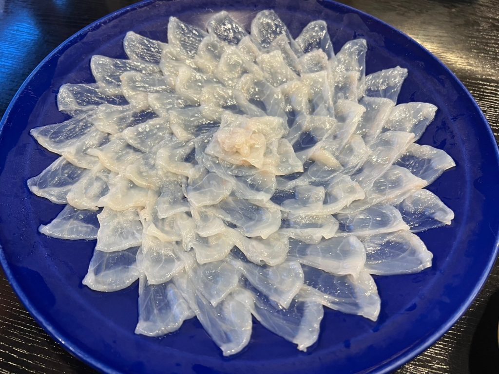 これだけの手間と時間をかけて大きくなったトラフグはブランド魚「若狭ふぐ」となり、下亟さんのご両親の手で捌かれ、透き通るような美しいてっさへと姿を変えます。