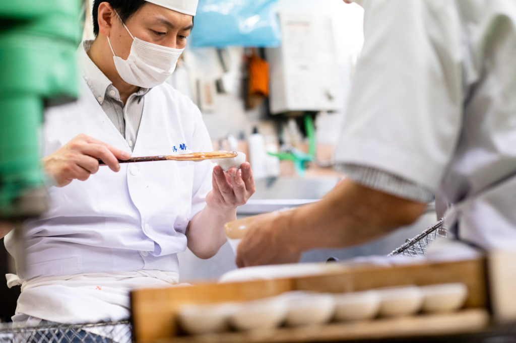「くずまんじゅうは、小浜の隣若狭町の熊川地区で生産された熊川くずとあんこ、雲城水だけでつくっています。生地は熊川くずと雲城水だけ。あんこから甘みを感じてもらうことで、しつこくなく、何個でも食べてもらえるような優しい甘味になるんです。伝承銘菓のくずまんじゅうですが、実はその日に合わせて作り方は変えています。気温とか湿度とか。お客さまにとってその日一番おいしいものを常に提供することを大切にしています」