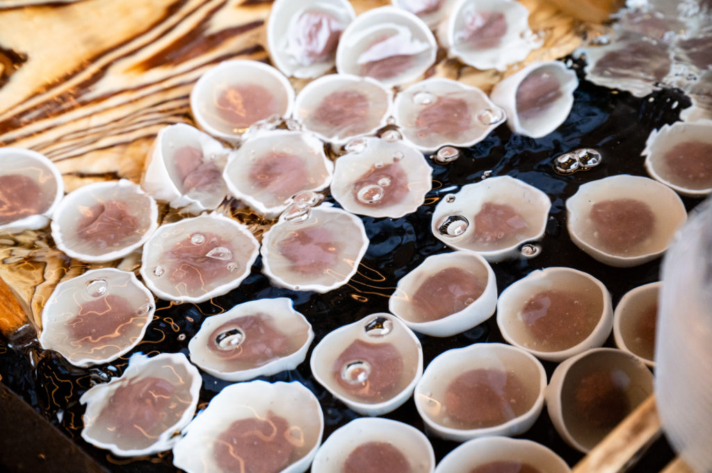 「くずまんじゅうは、注文が入ってから水から引き上げて食べてもらいます。くずのデンプンは時間が経つと白く濁り硬くなるので、食感が変わってしまう。食べ頃は、水から上げて1時間以内です。この小浜に来ないと食べることができないことは良さでもあるのですが、お土産には向かない。そこで、持ち帰ってからも、くずと雲城水のおいしさを味わってもらえるお菓子を最近作りました」