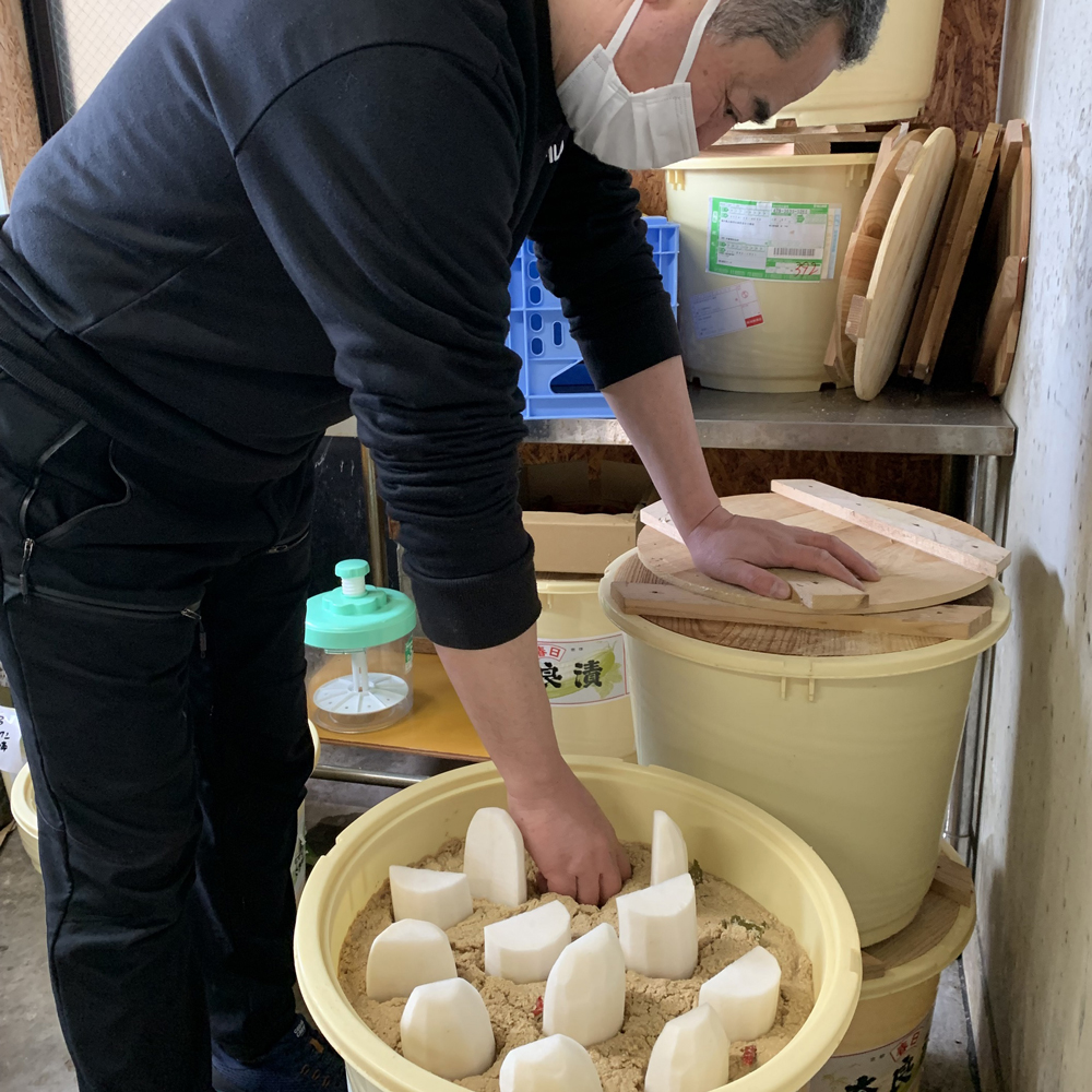 漬物をつける店主の今富博一さん。昔ながらの味付けが大人気の商品