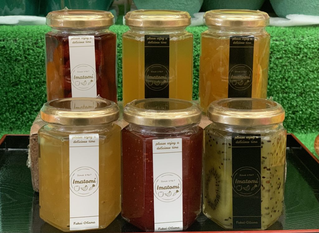 「うちは、今富食料品の店頭だけでなく、隣のおおい町と高浜町にあるスーパーのサニーマート3店舗(おおい店、南店、 高浜店)にも漬物や惣菜などを毎日納品しています。だから朝4時から調理を始めて、それらをパック詰め。ラベルを貼って、朝10時までに各店舗に届けています。道の駅若狭おばまにも季節のジャムや小浜産野菜を取り扱っていただいています」と博一さんが話してくれた。