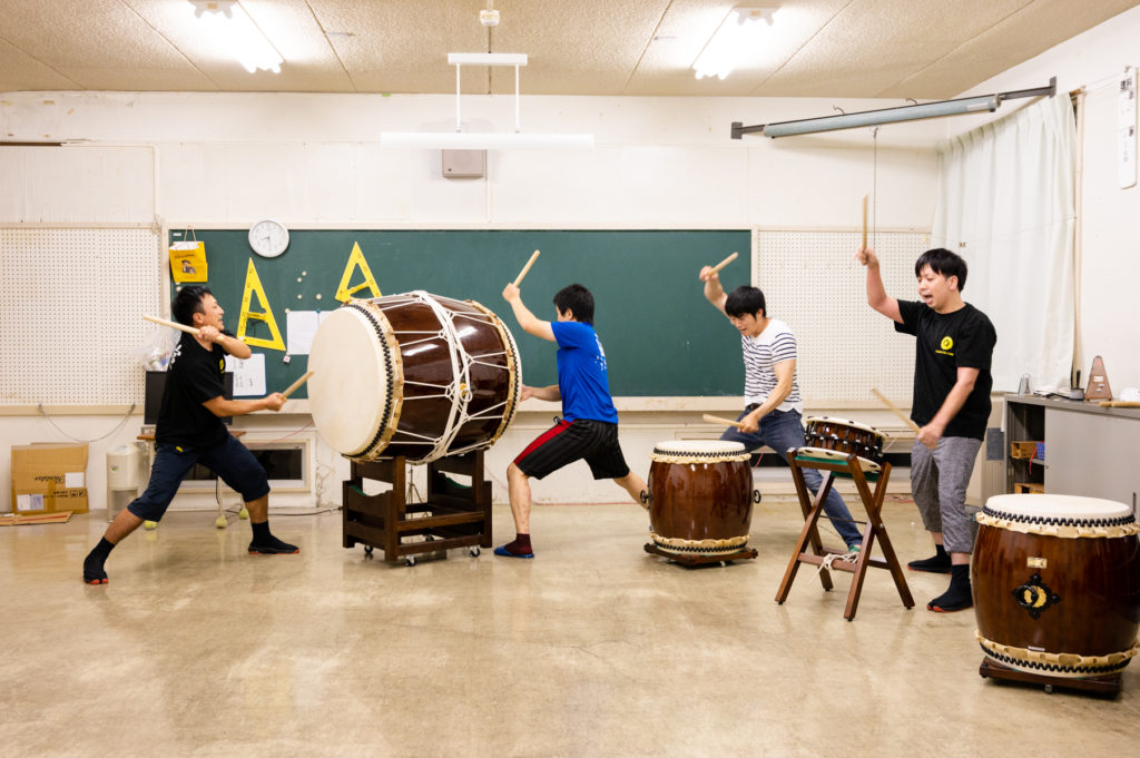 真っ暗な道を走っていると旧宮川小学校から勇ましい太鼓の音が聞こえる。明かりの灯る教室の扉を開けると若者が力強く太鼓を叩いていた。