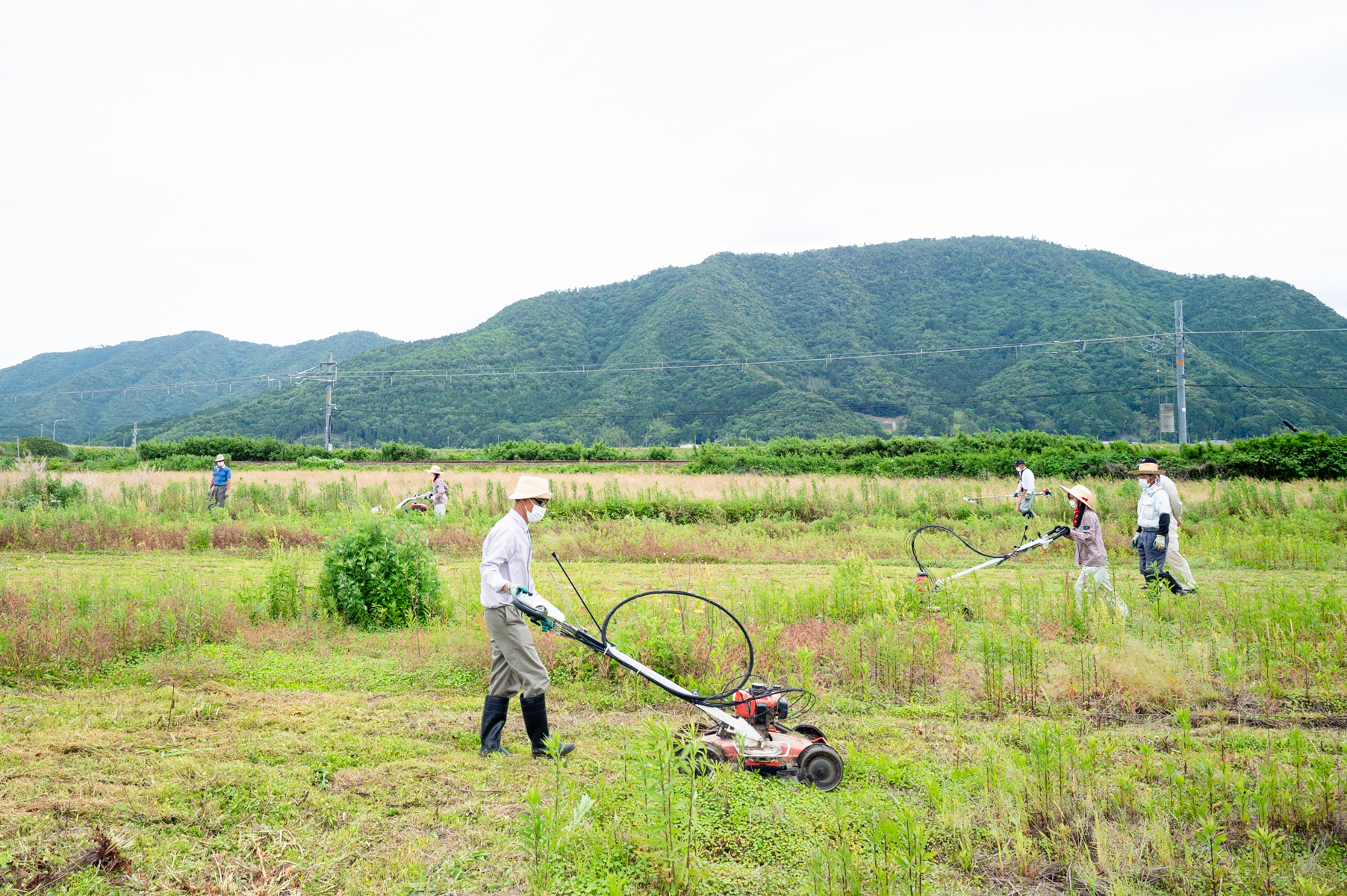 「今日は、福井県立若狭東高等学校から要望があって、遊休農地をひまわり畑に変えるための草刈りを学生と一緒にやっています」と、にこやかに話してくれたのは、小浜市農業委員会会長であり、株式会社永耕農産の監査役であり、一般社団法人あんじょうしょう会の代表理事と、いくつもの顔を持つ西田尚夫さん。