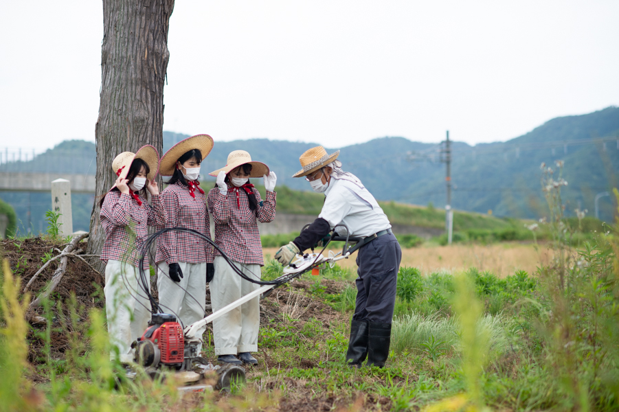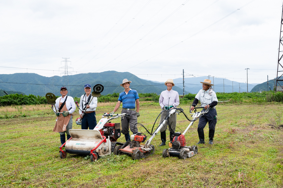 「地域は、バトンタッチできないと弱ってしまう。あんじょうしょう会は定年後の仕事確保だけではなく、若い人が松永に入りやすい状況をつくるために設立しました。ぼくらのできることは、常に未来のことを考えて次の人が乗りやすいレールを敷いてあげること。それが役目だし、自分たちの地域は自分たちで守らなくてはいけない」西田さんが見つめる先では、草刈り隊が学生に草刈り機の使い方を丁寧に教えていた。