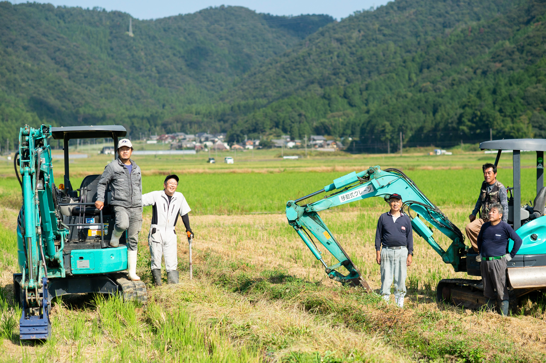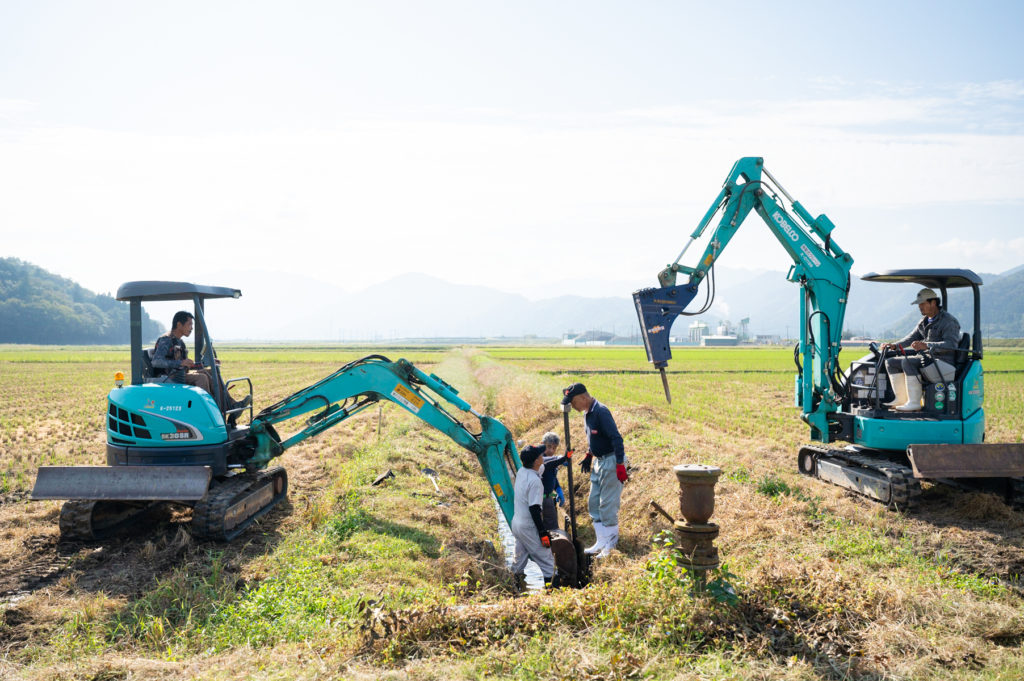 真っ青な秋空が広がる収穫後の田んぼで、カンカンカンと大きな音を響かせる場所に伺うと「太良庄荘園の里保全隊」の高鳥佐太一(たかとり さだかつ)さんが話してくれた。大きな音の正体は、繊細に力強く動く二台のショベルカー。排水路の側面パネルを固定するための矢板と呼ばれる金属の板を地面に打ち付けていた。太良庄では、平成19年頃から老朽化した排水路を自分たちの手で修繕している。