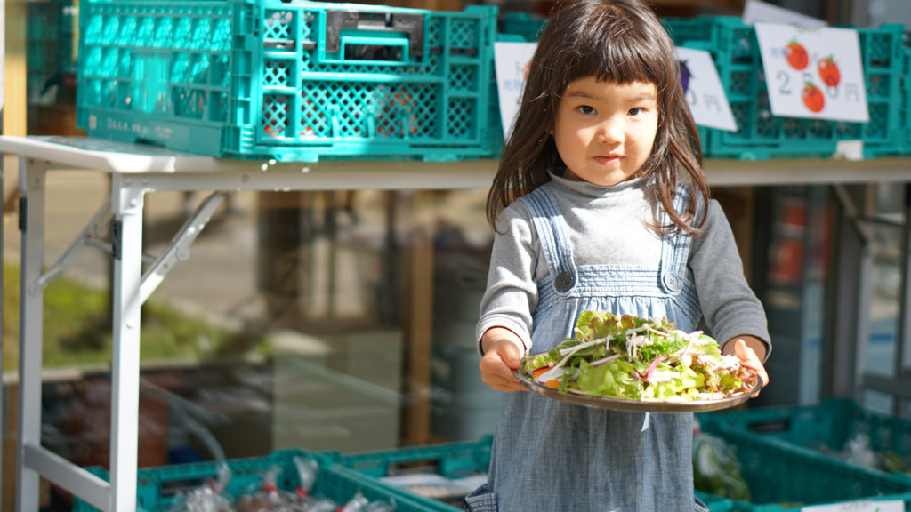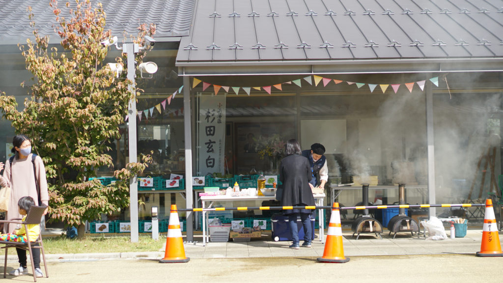 会場に伺うと、小浜市の駅前にお店を構える「Bistro mouton」(ビストロムートン、以下ムートン)が生地から手作りしたピザを焼き上げ、木材と香ばしい小麦の香りを漂わせていた。まちの駅内にあるセレクトショップ「TEtoKI」の前では、地元野菜を多く取り扱う「赤井商店」が野菜をずらりと並べ、ちょっとした縁日のようだった。