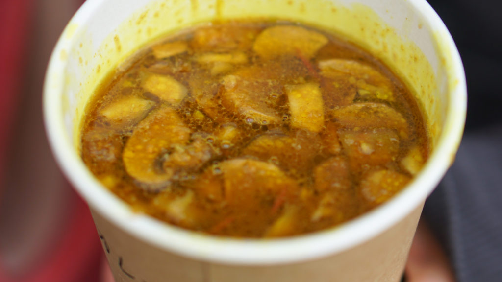 販売されていたのは、カレースープとクラムチャウダー。二種類とも本来捨てられる皮や茎などの部位から出汁をとり、動物由来の材料は使っていないとのこと。小山さんの実践する野菜づくりでは農薬を使わないので、出汁をとるのにも向いているそうだ。実際にカレースープを飲んでみたが、とても野菜だけの出汁とは思えないコクが感じられ、とてもおいしかった。