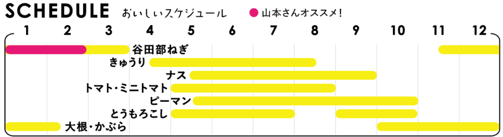 谷田部ネギ、きゅうり、ナス、トマト、ミニトマト、ピーマン、とうもろこし、大根、かぶら