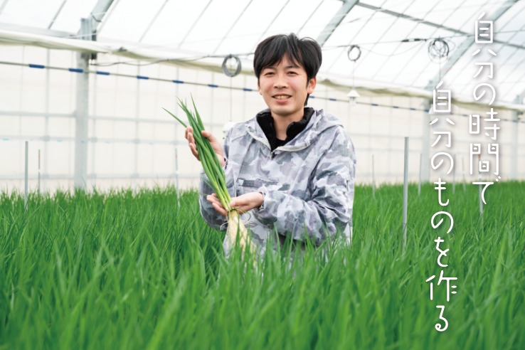 青ネギは、苗から収穫まで一貫した栽培をおこなっていること。あと、青ネギを高品質で安定供給するため、作業台や水耕棚の高さを体の負担が少なくなるよう工夫したり、病気や虫を発生させないための衛生管理など、ハウス内の環境づくりを意識しています。農業は、自分で決めて自分で動けるので、実践と結果が近いことも良いですね。