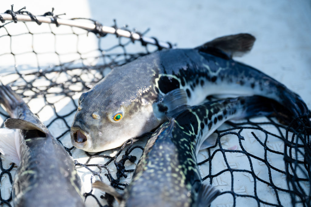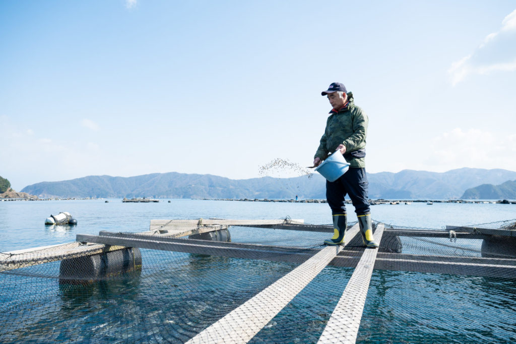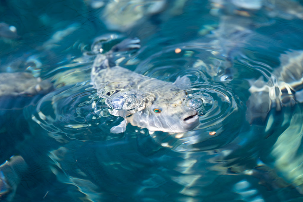 食用ふぐの中で最も高級とされ、味も絶品のトラフグ。若狭湾で育てられたトラフグ「若狭ふぐ」が堪能できる民宿を営みながら、養殖漁業をしています。若狭ふぐはぷりぷりとした身の締まりと淡白な甘みが特徴で、刺身や唐揚げ、鍋などどんな料理にしても食べ飽きません。ふぐと海の状態に合わせてエサの量を調整し、歯の手入れや網の掃除など、養殖には手間のかかることもありますが、民宿に来るお客さんに喜んでもらえるよう、日々の観察は欠かせません。