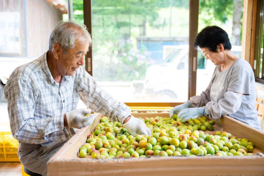 少しのキズがランクを分ける品質規格が厳しい福井梅。多田ヶ岳の麓で育てた梅を、ひとつひとつ手作業で収穫し、全ての実を目視検品して出荷しています。それもみんな「お客さんに良いものを届けるため」。梅の花が咲くと、夫婦で「今年もいよいよ始まる」と、自然にスイッチが入ります。測量・設計・地質調査などを業務とする「(株)澤田調査設計」を営みながら、「西田梅」と呼ばれる梅のブランドを守っていくため、たくさんの手間をかけた高い品質のおいしい梅づくりをしています。