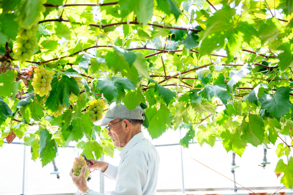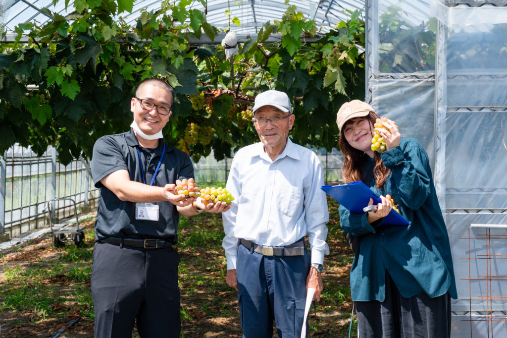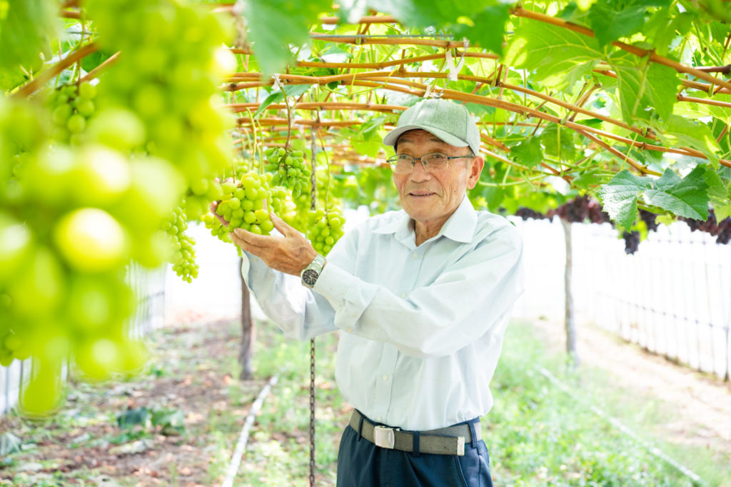定年退職後の趣味の一つとして、一寸そら豆やトマトなどさまざまな露地栽培をしていました。しかし、獣害の増加もあり、今はハウスでぶどうの栽培をしています。昼夜の寒暖差がない地域条件で、品種の特色を出すことが難しいですが、ぶどうは今まで作った作物の中で、みんなが一番喜んでくれます。食べてくれる人のことを考え、出荷前には必ず一粒味見。「おいしい」と言っていただくことが最高の励みになっています。