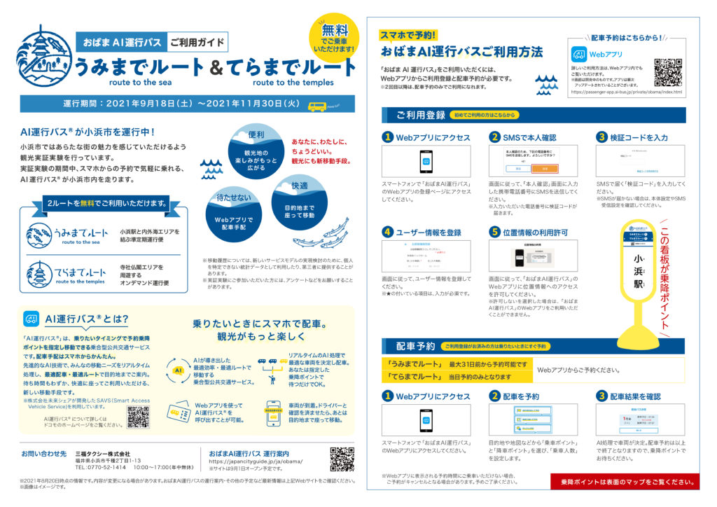 三福タクシーと共にこのバス運行を企画した「おばま観光局」担当者に話を伺ったところ、「小浜市には、福井県唯一の国宝の木造建造物・明通寺をはじめ、優れた寺社仏閣が多数あり、『海のある奈良』とも言われるほどですが、それらの多くは山あいにあるため、公共交通機関で行くことは難しい状況にあります。また、小浜市の海沿いにある民宿も公共交通機関で行くことは難しく、特にマイカーを持たない都市部の観光客のアクセスが課題となっています。このため、AI運行バスを期間限定で運行し、これらの観光施設へのアクセス改善を行います。この『AI運行バス』の運行は北陸では初となります。」とのこと。