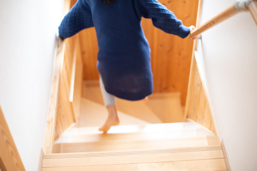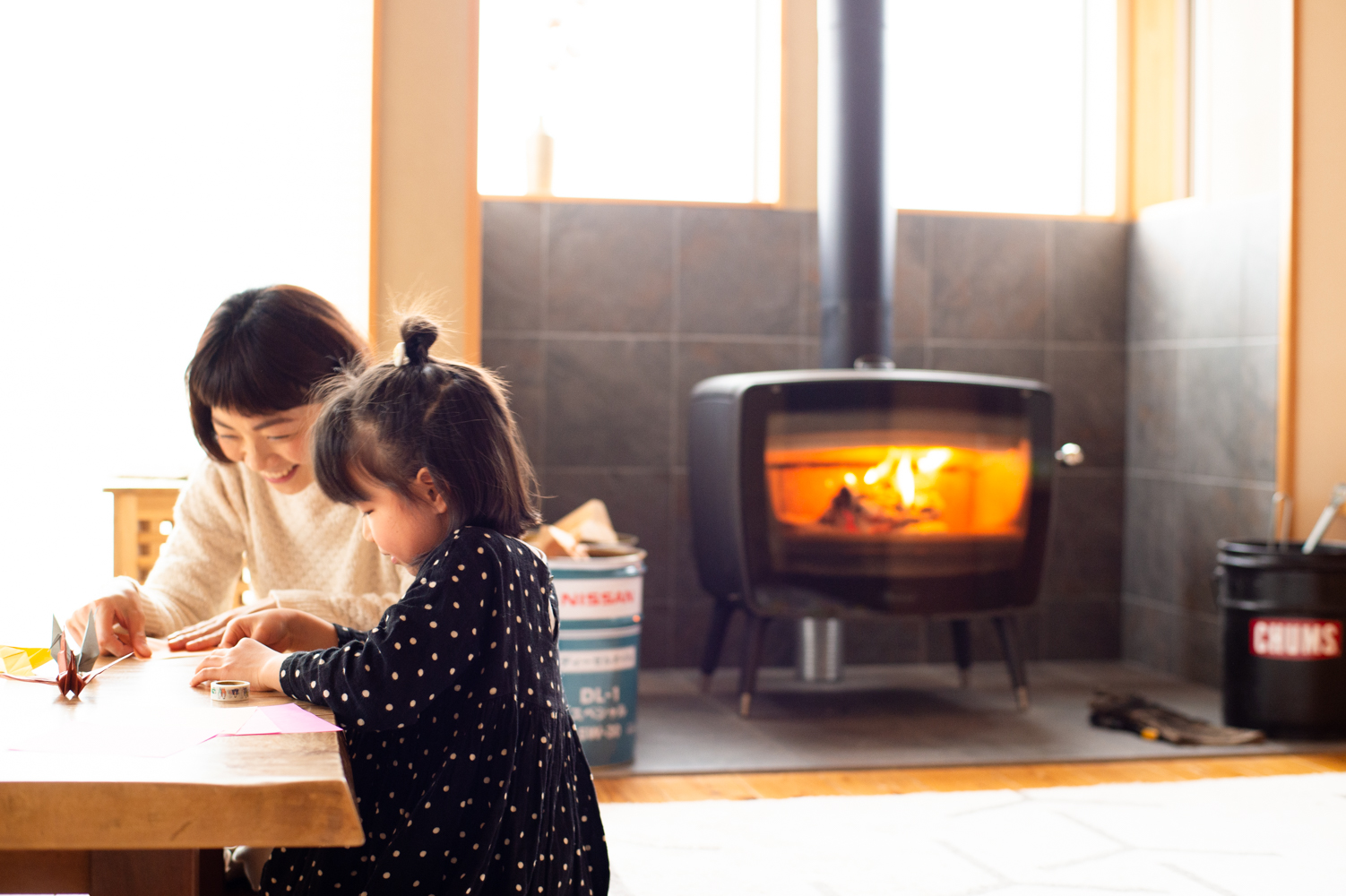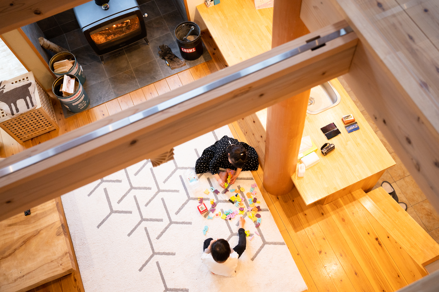 薪ストーブの心落ち着く明かりが、しゃがんで遊ぶ家族をそっと照らす温もりの木の家。